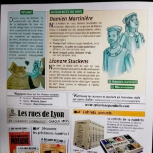 Les Rues de Lyon est un mensuel bd où, à chaque numéro, un artiste local lyonnais raconte en 10 pages un point d’histoire de la ville en BD, de manière didactique. Chaque numéro est indépendant. Vous pouvez donc picorer dans cette grande bibliothèque du savoir lyonnais. Evènements, faits historiques, personnalités, anecdotes propres à la ville… une multitude de thèmes sont abordés.