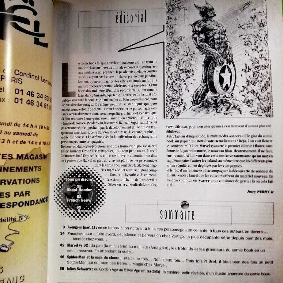 Nous ne traitons que des comics, et pas de leurs produits dérivés (films, tasses, statuettes…). Scarce existe depuis 1982, ce qui en fait un des plus vieux fanzines au monde. L’ensemble des numéros forme une encyclopédie critique unique sur la bandes dessinée américaine, avec des sujets traités en profondeur, sans équivalent sur le net.