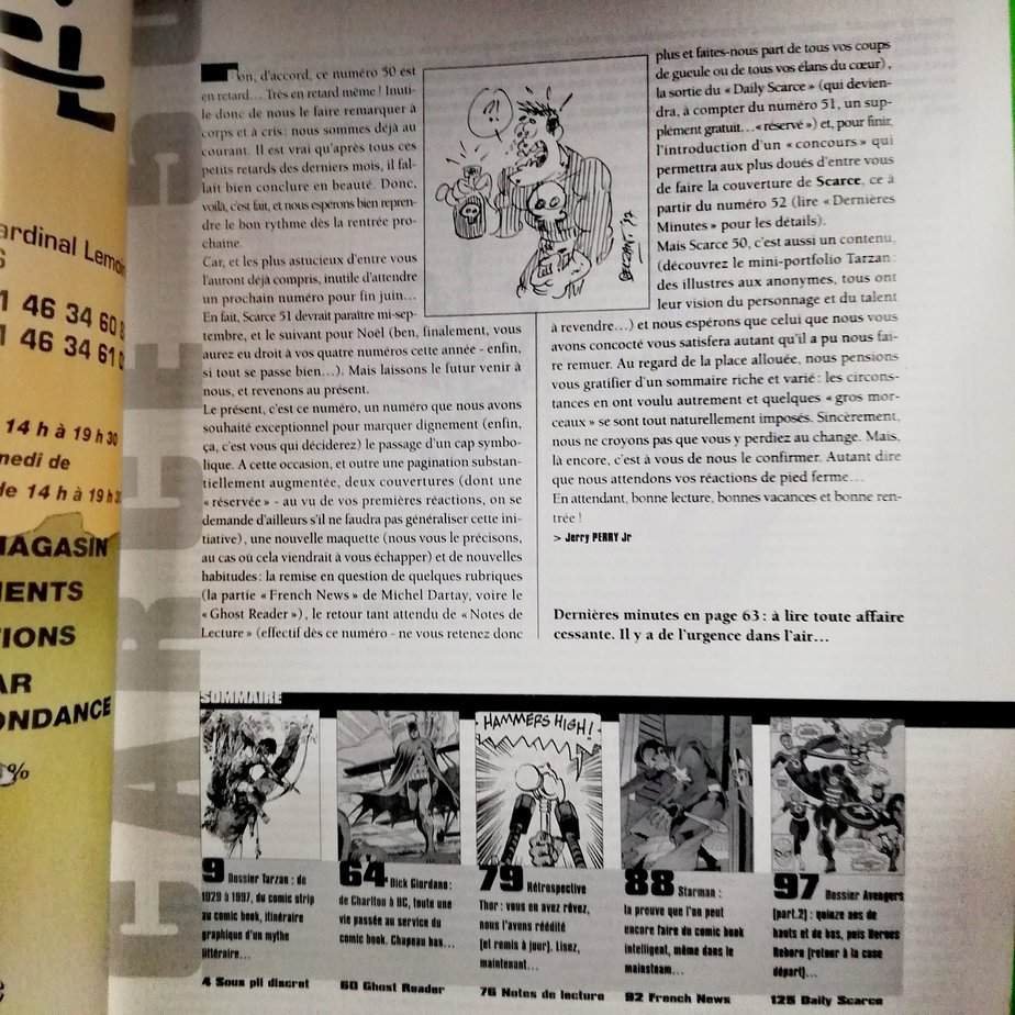 Nous ne traitons que des comics, et pas de leurs produits dérivés (films, tasses, statuettes…). Scarce existe depuis 1982, ce qui en fait un des plus vieux fanzines au monde. L’ensemble des numéros forme une encyclopédie critique unique sur la bandes dessinée américaine, avec des sujets traités en profondeur, sans équivalent sur le net.
